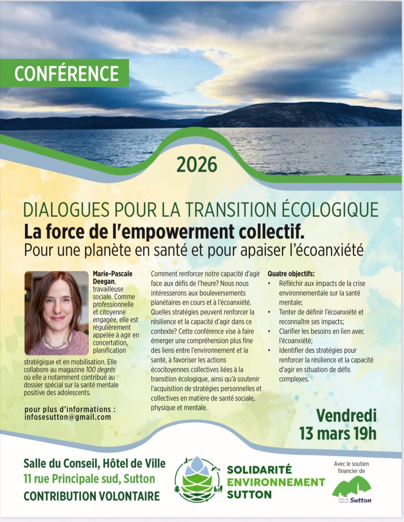 Solidarité environnement Sutton vous invite à une de Marie-Pascale Deegan, « La force de l’empowerment collectif », vendredi le 13 mars à 19h, à la salle du conseil de ville de Sutton, 11 rue principale S, Sutton.