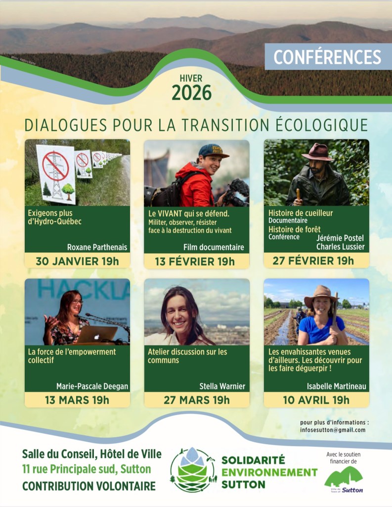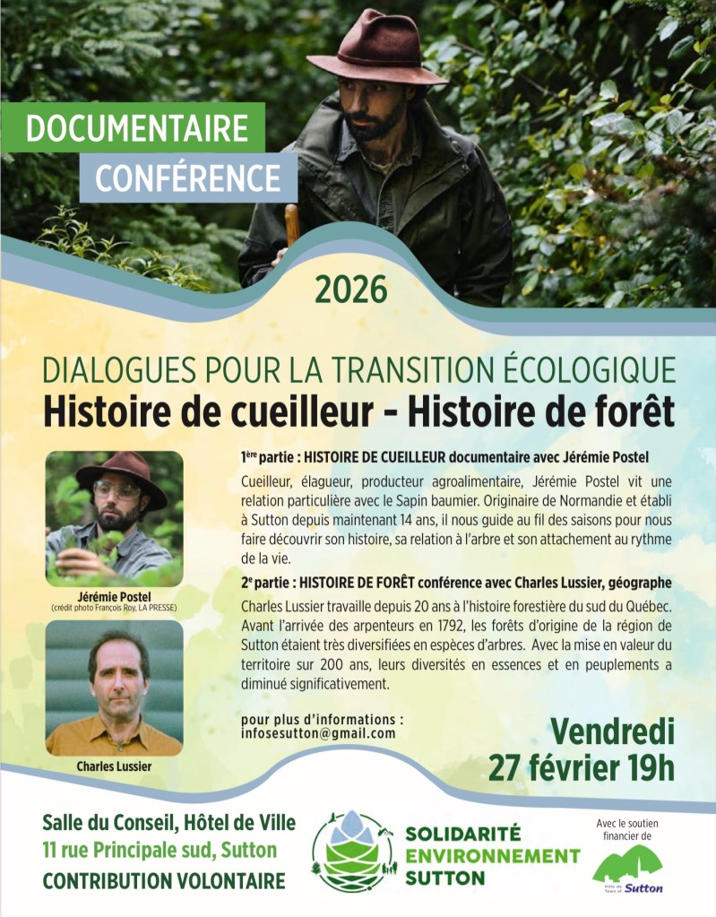 SES vous invite à un documentaire « Histoire de cueilleur » et à une conférence « Histoire de forêt », vendredi le 27 février à 19h, à la salle du conseil de ville de Sutton, 11 rue principale S, Sutton.