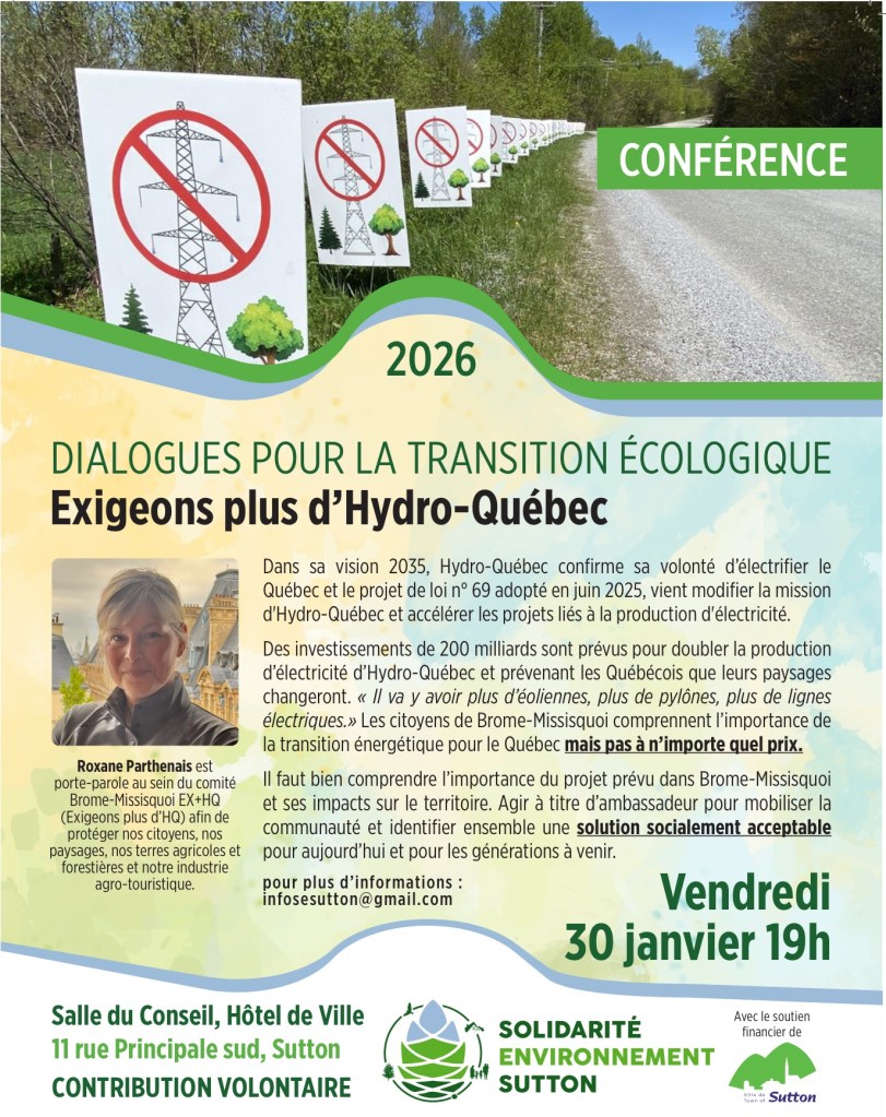 Solidarité environnement Sutton vous invite au premier événement de 2026. Une conférence de Roxane Parthenais intitulée « Exigeons plus d’Hydro-Québec », le 30 janvier à 19h, à la salle du conseil de ville de Sutton, 11 rue principale S, Sutton.