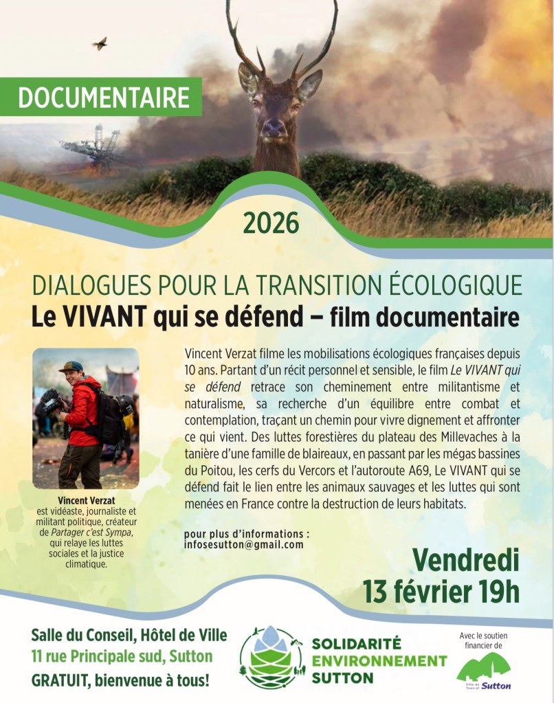 Solidarité environnement Sutton vous invite à un documentaire de Vincent Verzat « Le VIVANT qui se défend », le 13 février à 19h, à la salle du conseil de ville de Sutton, 11 rue principale S, Sutton.