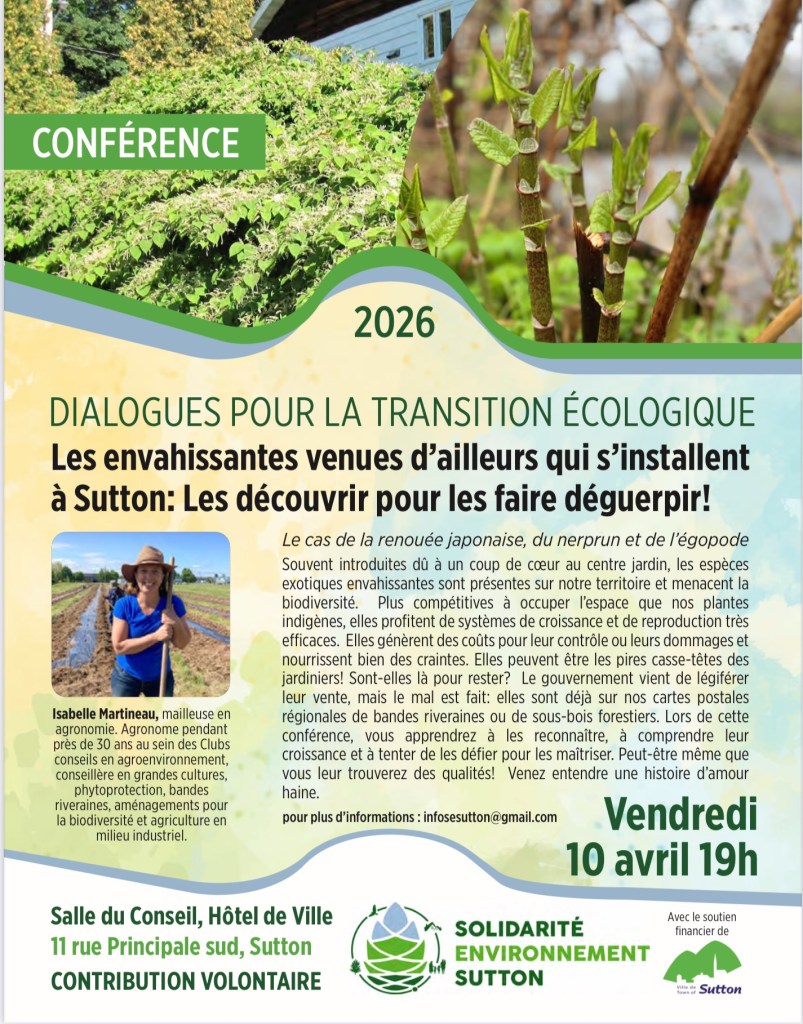 SES vous invite à une conférence de Isabelle Martineau, mailleuse en agronomie et conseillère en grandes cultures, « Les envahissantes venues d’ailleurs », vendredi le 10 avril à 19h, à la salle du conseil de ville de Sutton, 11 rue principale S, Sutton.