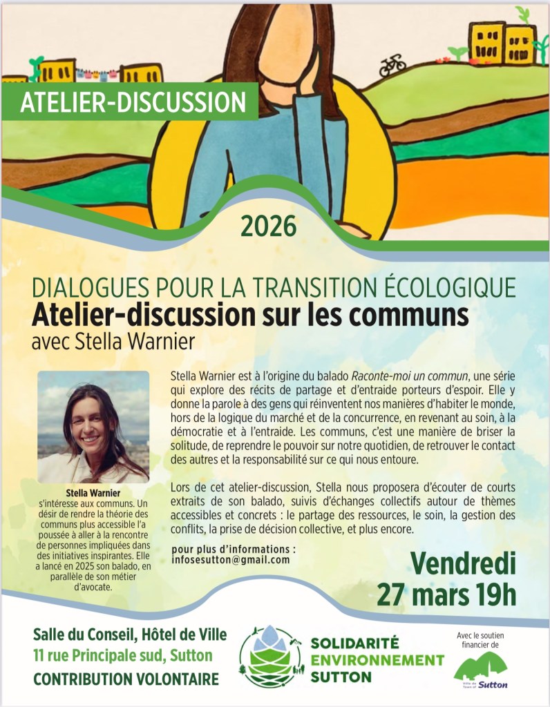 SES vous invite à une conférence de Stella Warnier, « Atelier-discussion sur les communs », vendredi le 27 mars à 19h, à la salle du conseil de ville de Sutton, 11 rue principale S, Sutton.